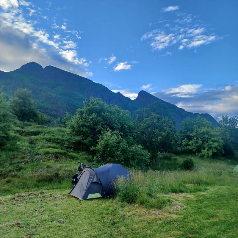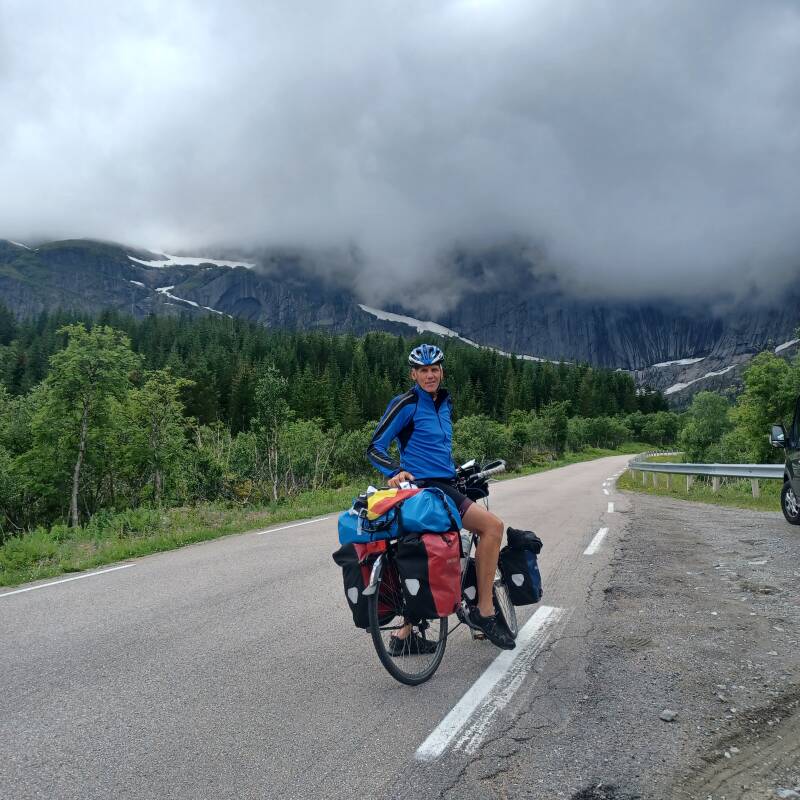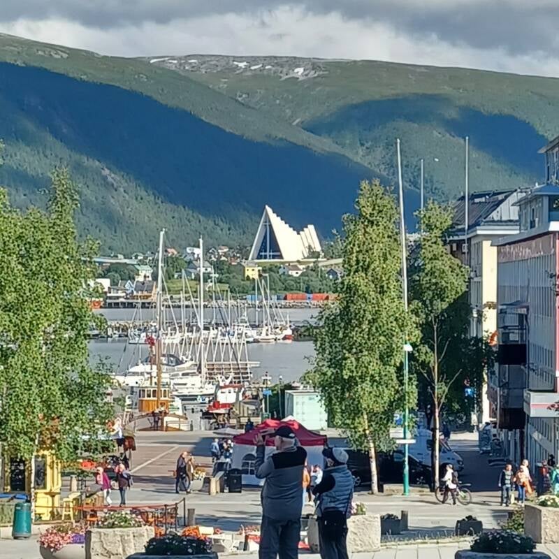 Maandag was ik in Tromso, een stevig groeiende stad, bekend van haar ijskathedraal, in het toch al 'hoge Noorden '. De steile en grillige bergtoppen van de eilanden en de omgeving van Tromso liggen nu achter mij. Ik zie nu vooral afgeronde en minder hoge heuvels. Dat betekent dat de weg ook terug over de bergen loopt. Zo fietste ik vandaag 27 km stijgend met oa 2 langere klimmen van in totaal 12 km. Het stijgingspercentage gaat niet hoger dan 7%, eens in een ritme gaat het klimmen vlot.