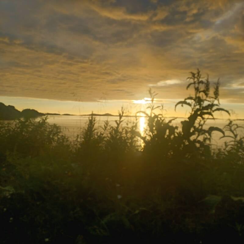 Omdat ik gisteren met mijn wildkampeerplekje aan de westzijde van het eiland stond, kon ik de eerste keer de middernachtzon in volle glorie bewonderen. Gelukkig was ze er dan ook. Na 3 regenachtige dagen was ze in de namiddag terug présent en zakte ze niet in de zee.