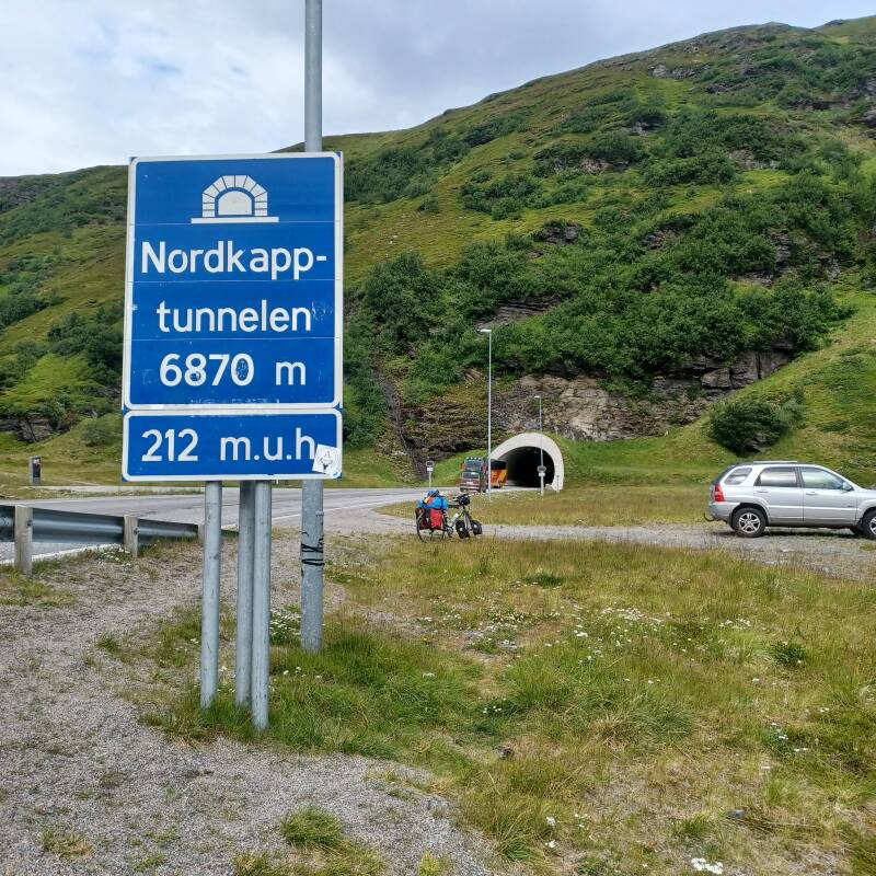 De weg slingert zich verder langs de zee tot ik in de verte "het tunnelgat" zie. Om op het eiland te komen, moeten alle weggebruikers door een 7-kilometer lange tunnel. De tunnel gaat tot 250 meter onder het zee-oppervlak, en daarna terug omhoog, met stijging tot 10%. Een hele bizarre en zelfs wat akelige ervaring. Het lawaai is oorverdovend als er verkeer nadert, gelukkig is het rustig onderweg. Na nog een, vlakke, tunnel van 4 km is de blijdschap groot om in Honningsvag te arriveren. Ik doe boodschappen voor 3 dagen en trek naar de plaatselijke camping.